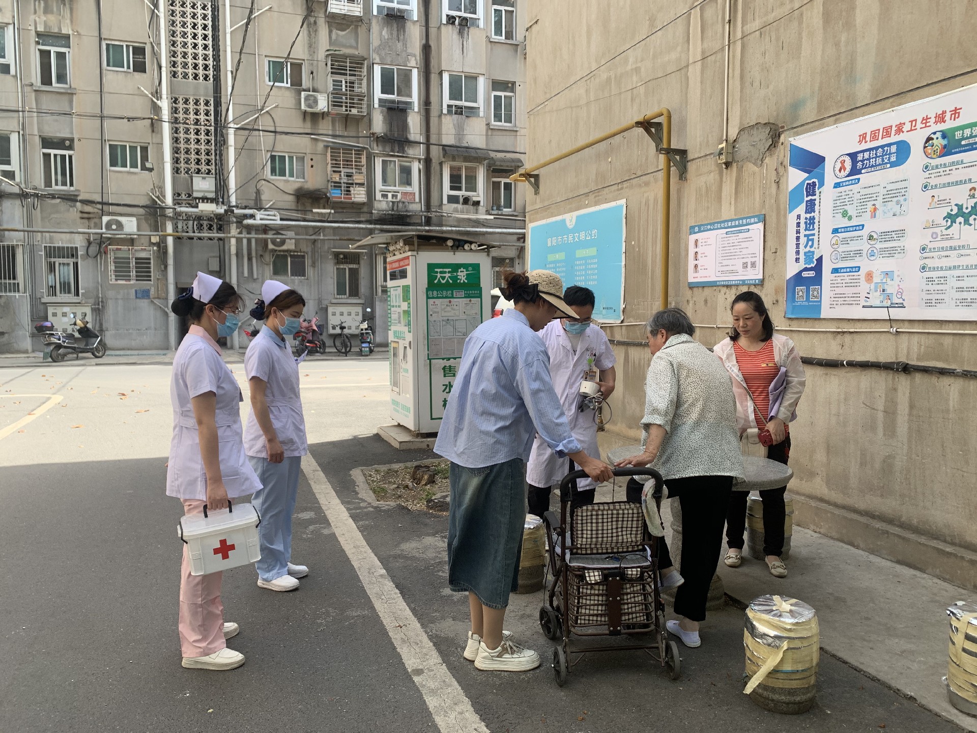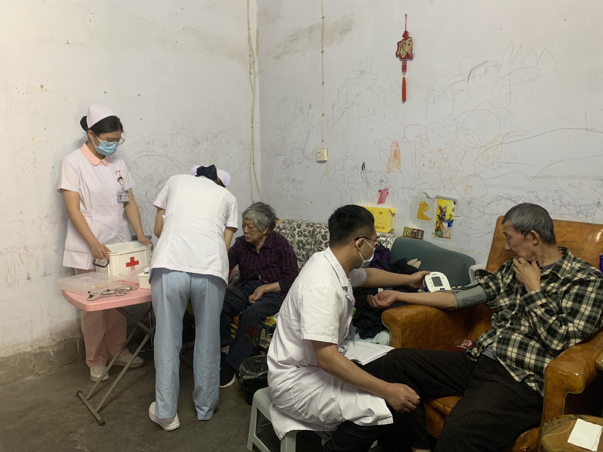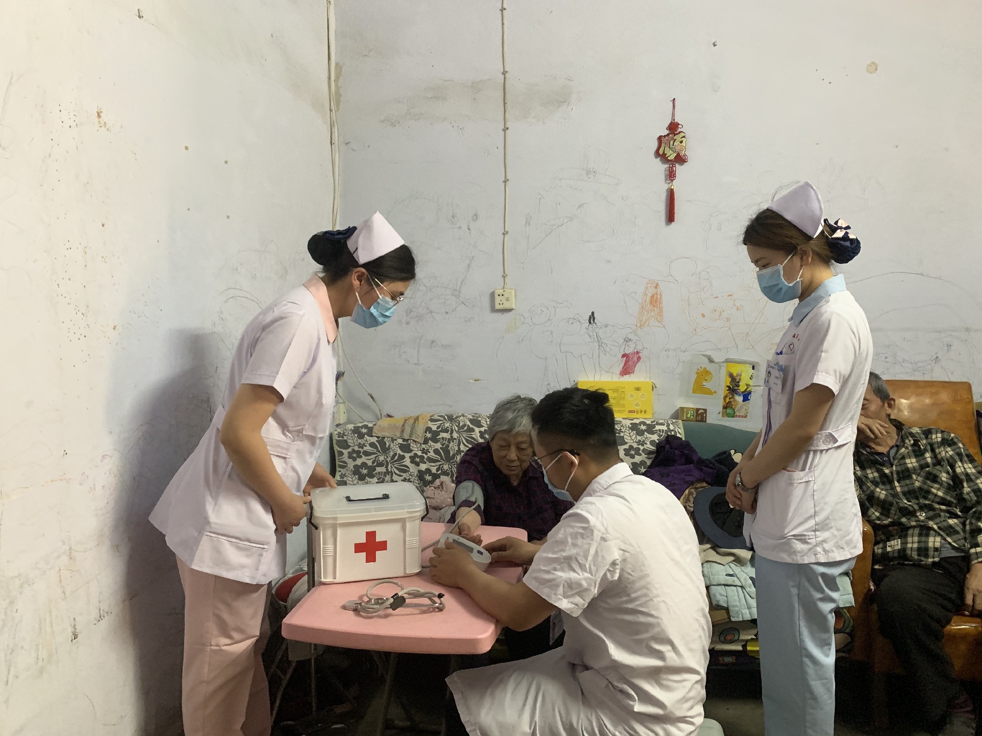 活动当天,院团委组织肾病内科、门急诊、妇产科青年医护人员,深入汉江小区行动不便的高龄老人家中进行健康检查,通过测量血压、血糖,详细询问病史及日常用药情况,提供专业的医疗建议。针对长期卧床易发的压疮问题,医护人员现场向家属指导预防方法,同时示范科学的康复动作和肢体按摩手法,帮助患者提升日常活动能力。对于行动不便的老人,青年医护主动走到跟前,蹲下身子耐心倾听需求,用“零距离”服务传递青春温度。